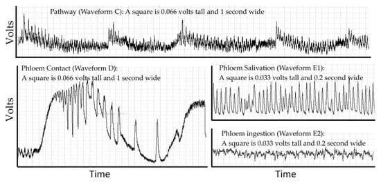 Probing behavior is monitored using electropenetrography (or an electrical penetration graph, EPG). This technique is the only real-time non-lethal approach to monitoring such behavior in opaque plant or animal tissues that obscures the location of the insect stylets. EPG overcomes this problem by making the host and insect a part of an electrical circuit via an electropenetrograph [12,13]. The circuit is complete only if some part of the insect (legs, ovipositor, or mouthparts) contacts the host. The resulting signal is generated by changes in resistance and by physical and biochemical processes that generate electrical potentials (abbreviated EMF) [14]. Resistance changes as the insect salivates onto or into the host, and electrons are then able to pass through the salivary canal. Resistance also changes depending on the type of saliva. Typically, the saliva of sheath feeding hemipterans (like D. citri) is classified as gelling saliva or watery saliva [15], but this simple classification hides a diverse biochemical composition derived from both the insect and endosymbionts (aphids [16]; D. citri [17,18]). Electrons also pass through the food canal when the insect ingests host fluids. Electricity is generated as fluids move in the narrow tubes of the stylets and is generated through muscle contractions in the insect [14,19]. There may also be signals from the part of the plant damaged by the herbivore to other parts of the plant [20]. The EPG recording is a combined signal from all sources showing diagnostic repetitive patterns from these processes that can be correlated to specific behaviors using histology, transparent artificial diets, transmission studies and other techniques. Electropenetrographs can be either alternating current (AC) or direct current (DC) depending on whether the electricity applied to the insect is AC or DC [21], and a new model can switch between AC or DC [22]. The result, regardless of the machine used for measurement, is a recording that is a sequence of repetitive patterns (Figure 1). Different insect species will have different patterns and allocate their time to each behavior in different proportions.