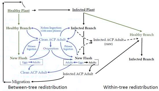 EPG data are best understood in the context of the interconnected lifecycles of the vector, endosymbionts, pathogen, and the plant host. A simplified schematic representation of the epidemiology of CLas transmission is provided in Figure 2, wherein the integrated and cyclic nature of these processes is emphasized. In a CLas-free citrus growing region, psyllids complete their life cycle without becoming infected. This part of Figure 2 has little bearing on disease transmission, except that it increases the pool of potential vectors. The first infected citrus tree occurs after either the migration of an infected adult or the importation of diseased plants into an area where the vector is already established. While it is possible for a healthy adult to feed on an infected plant and thereby acquire CLas, nymphs that acquire CLas have from 10 to 100 times the bacterial load 15 days post-eclosion, compared to psyllids that acquired the bacteria as adults [37]. The most consistent route for acquisition is by late instars. Immature psyllids that acquire CLas are more capable of transmitting relative to psyllids that acquire CLas as adults [37,38,39,40], and adults that acquired CLas as late instars transmit CLas 43.4% of the time, relative to psyllids that acquire CLas as adults that transmit 11.8% [41].