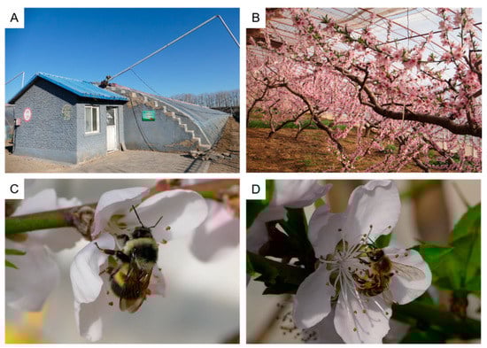 Peach solar greenhouse and bee pollinators. (A) Solar greenhouse in northern China; (B) peach trees (Prunus persica “Okubo”) in solar greenhouse; (C) worker of Bombus lantschouensis visiting peach flower; and (D) worker of Apis mellifera visiting peach flower.