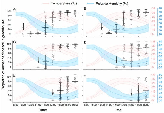 Peach anther dehiscence dynamics under solar greenhouse conditions. The panels (A–F) represent anther dehiscence dynamics of flowers opened at different time of day. The arrows indicate the time when flowers fully opened. Data are presented as the mean ± S.D.