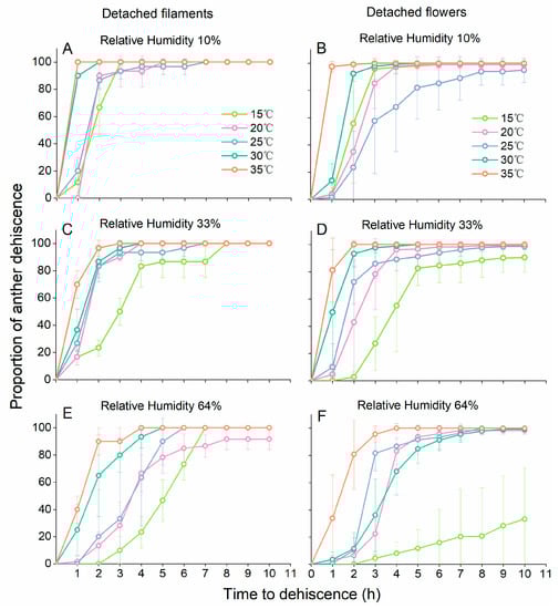 Effect of temperature and relative humidity on time to anther dehiscence in detached filaments and detached flowers. The panels (A,C,E) represent anther dehiscence in detached filaments at 10% RH, 33%RH and 64% RH, and the panels (B,D,F) represent anther dehiscence in detached flowers at 10% RH, 33%RH and 64% RH. Data are presented as the mean ± S.D. At least three filament groups (each group contained 10 undamaged filaments) and at least six undamaged flowers were observed in each experimental unit.