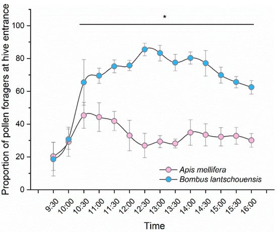 Daily pattern of pollen-collecting activity of Apis mellifera and Bombus lantschouensis in the peach solar greenhouse. The behaviour data were obtained from eleven days and a total of 154 behaviour records were obtained for both the honeybee colony and bumblebee colony. Data are presented as the mean ± S.D. The “*” indicates significant difference between the proportion of pollen foragers of honeybee and bumblebee. The number of pollen foragers at the hive entrance divided by the number of total returning foragers was calculated as the proportion of pollen foragers. Independent-sample T tests were used to compare the differences in pollen forager proportions between honeybees and bumblebees at each time point (Table S1).