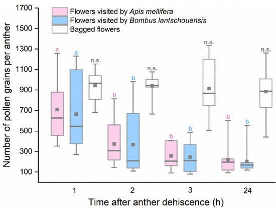 Number of residual pollen grains in anthers from flowers visited by Apis mellifera and Bombus lantschouensis. Different letters indicate significant differences in number of pollen grains among different time based on the Duncan test at α = 0.05. Boxes indicate quartiles with the median marked as a horizontal line and the mean marked as a dot.