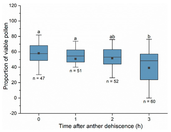 The proportion of viable pollen at different times after anther dehiscence. Pollen viability was tested using TTC. The difference in pollen viability at different times was compared using the Kruskal–Wallis test. Different letters indicate significant differences in pollen viability based on the Dunn–Bonferroni test at α = 0.05. Boxes indicate quartiles with the median marked as a horizontal line and the mean marked as a dot.