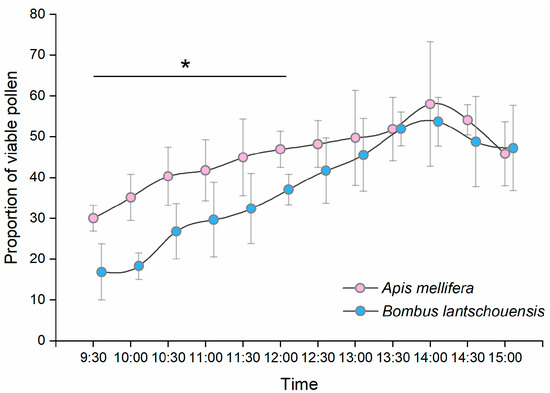 The proportion of viable pollen carried by honeybees and bumblebees differed significantly over time during the day (Figure 7). The proportion of viable pollen carried by both bee species increased over time in the morning and reached a peak at approximately 14:00 h and then decreased in the afternoon. From 9:30 h to 12:00 h, the pollen carried by honeybees had higher viability than that carried by bumblebees, and there was no significant difference in the viability of pollen carried by different bee species after 12:30 h (Table S2).