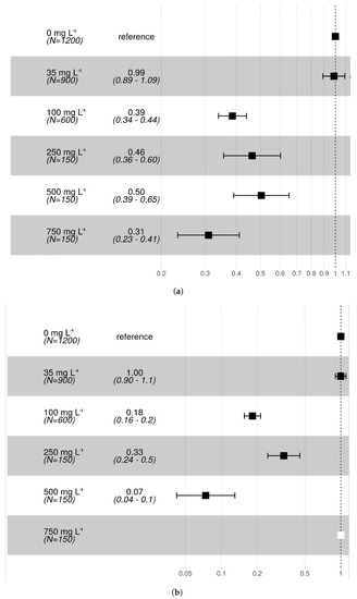 One hundred and fifty Ae. aegypti eggs were hatched for each treatment and control. Each tray was inspected visually each day to count live pupae before eclosion, until no living larvae or pupae remained in the trays. This experiment was replicated six times for the 35 mg L−1 and four times for the 100 mg L−1 concentrations. Each replicate was coupled with a control. Differences in survival to pupation (SP) between control and treatments (henceforth expressed as “hazard ratios of pupation”) were analyzed through a Cox proportional hazards (CPH) model, including a cluster variable to control for the effect of individual replicates.