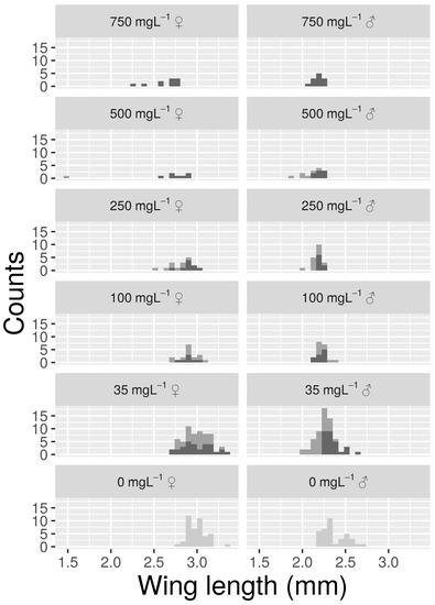 Wing lengths followed a pattern similar to that observed for SP (Figure 2). Model parameters showed that mosquitoes from control groups had an estimated WL of 3.01 and 2.37 , for females and males respectively (Table 1). Samples from 35 mg L−1 did not show significant differences in WL for Rb. On the contrary Cs at 35 mg L−1 reduced male WL by 0.16 but did not have a significant effect on females. One or both of the sexes showed a consistent decrease in WL for Rb or Cs concentrations of 100 mg L−1 or higher. At a Cs concentration of 500 mg L−1, the only emergent adult female had wings that were very short (1.5 ) and deformed.