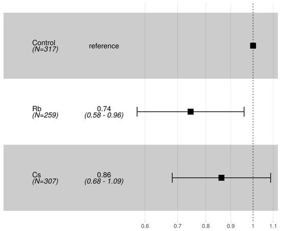 The average SP in the control groups was 79.6% (Table 1). The treatment at 35 mg L−1 concentration showed no difference in the hazard ratio of pupation compared to controls, both for Rb and Cs (Figure 1). On the contrary, higher concentrations of both Rb and Cs resulted in decreased pupal survival. Overall, results revealed that at equivalent concentrations, larvae treated with Cs were exposed to a higher hazard of death before pupation than Rb. For an increase of Cs concentration from 35 to 100 mg L−1, the average hazard ratio of death increased from 0% to 82% for Cs and from 1% to 61% for Rb. Pupation did not occur in the 750 and 1000 mg L−1 treatments for Cs or in the 1000 mg L−1 treatment for Rb. The day of first pupation was delayed by one day (from day 5 to day 6 following egg submersion) at Cs concentrations 100 mg L−1 and higher and at Rb concentrations 500 mg L−1 and higher.
