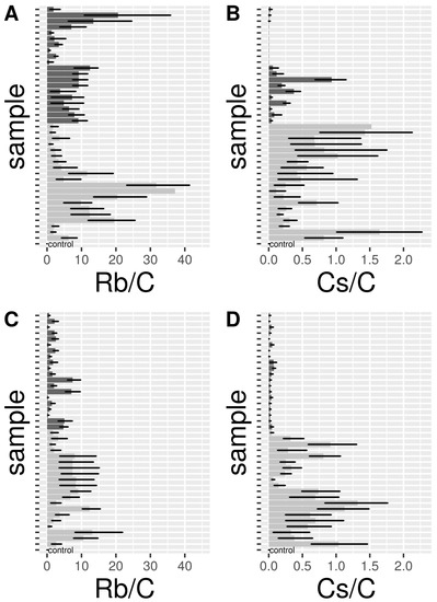 - Campbell, L.M.; Fisk, A.T.; Wang, X.; Köck, G.; Muir, D.C. Evidence for biomagnification of rubidium in freshwater and marine food webs. Can. J. Fish. Aquat. Sci. 2005, 62, 1161–1167. [Google Scholar] [CrossRef]