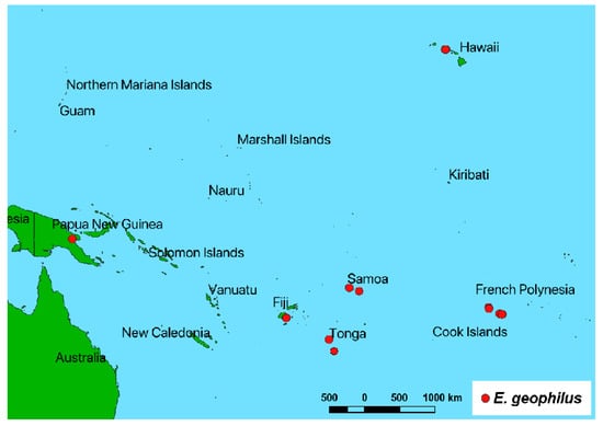 The SCAN database has 29 occurrence records of E. geophilus (under the junior name E. subtruncatus) with 15 from the United States National Museum’s Entomology Collection (USNM), 11 from the University of Hawaii Insect Museum (UHIM), two from the Hawaii Department of Agriculture, Pest Control Branch (HDOA), and one from the Arizona State University Charles W. O’Brien Collection (ASUCOB). All of the specimens from collections besides the United States National Museum’s Entomology Collection were collected in Hawaii between 1918 and 2010.