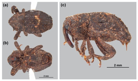 Habitus of Elytroteinus geophilus: (a) dorsal; (b) ventral; and (c) lateral views.