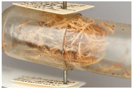 The USNM weevil collection houses 15 specimens of E. geophilus. The earliest record is of two specimens from Tahiti collected in 1916 from Vanilla planifolia Jacks. ex Andrews (Orchidaceae). The most recent record is from 1978 of a specimen intercepted in Hawaii from Tonga in yam root (Dioscoreaceae). Three additional specimens are from Tahiti, two collected on Zingiber sp. and the third on ginger (Zingiber officinale Roscoe). Most specimens in the collection were taken from yam (Dioscorea), including two specimens reared in 1918 in San Francisco by the California State Commission of Horticulture from yams originating from Fiji. A specimen intercepted in 1931 in Honolulu, originating from Samoa in A[illegible]a root, was preserved with its fiber cocoon (Figure 3). The use of fibers to spin a cocoon was not a previously reported behavior of this species. In addition to the specimens in the USNM’s weevil collection, at least 11 more specimens of E. geophilus have been intercepted between the years 1995–2013 and 18 more occurrence records are reported in SCAN.