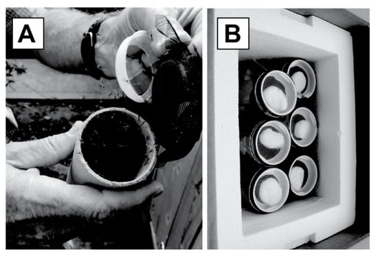 (A) Release of Aedes aegypti PPF-treated males from cardboard shipping tubes. (B) Shipping container with cardboard tubes topped with mesh and a sucrose-soaked cotton ball.