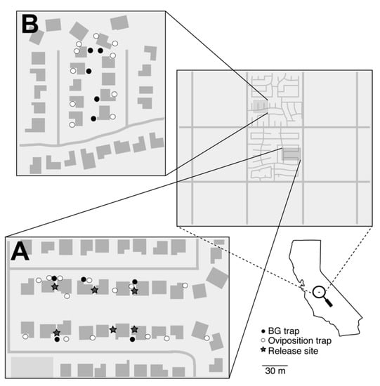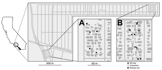 Map of the (A) treated and (B) untreated locations in Clovis, CA. Open circles represent artificial oviposition sites that were surveyed for eggs, larvae, and the presence of PPF using bioassays. Closed circles represent BG traps used to monitor adult populations. The stars represent release locations of PPF-treated A. aegypti males.