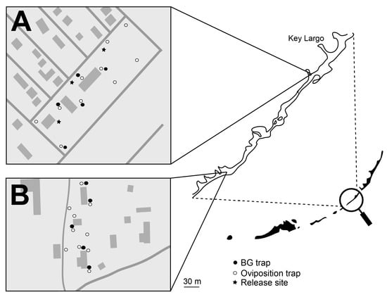 Map of the (A) treated and (B) untreated locations in the Florida Keys, FL. Open circles represent artificial oviposition sites that were surveyed for eggs, larvae, and the presence of PPF using bioassays. Closed circles represent BG traps used to monitor adult populations. The stars represent release locations of PPF-treated A. aegypti males.