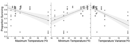 Mean survivorship for all shipments was 86% ± 2% (Mean ± SE). Mortality varied among treatments, i.e., shipments (F(8,43) = 9.62, p < 0.0001). Since the internal temperatures of shipping packages varied, we used bivariate correlation to examine for a relationship between mortality and temperatures experienced during shipment. As shown in Figure 5, survival was negatively correlated with both the maximum (r(52) = 0.22, p < 0.0001) and minimum (r(52) = 0.35, p < 0.0001) temperatures. Greater mortality was also observed with males that experienced greater temperature variations during shipment (r(52) = 0.48, p < 0.0001).