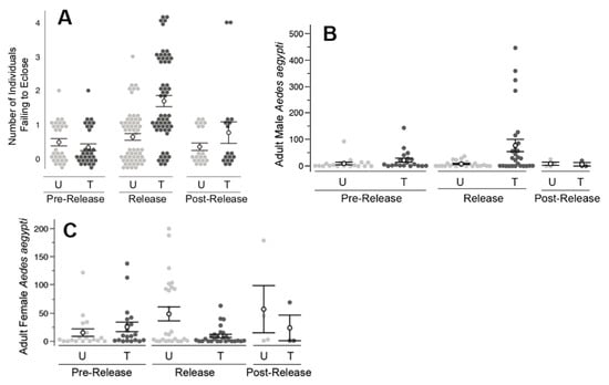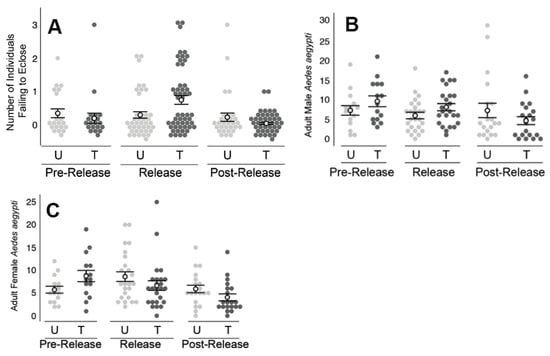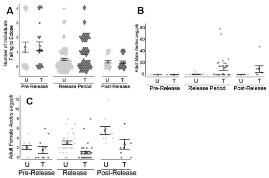 Results from field releases in Clovis, CA. (A) During the release period only, individuals reared in water samples from the treated (T) area experienced higher mortality (p < 0.05), relative to that observed from the untreated (U) area. (B) During the release period only, the number of adult males in the treated area was slightly elevated (p < 0.05) relative to that observed in the untreated area. (C) Between the pre-release and release periods, the number of adult female A. aegypti decreased at the treated area. In contrast, the number of A. aegypti females at the untreated area was observed to increase during the same time periods. Filled circles represent the raw data measurements. Hollow circles are the means with standard error bars.