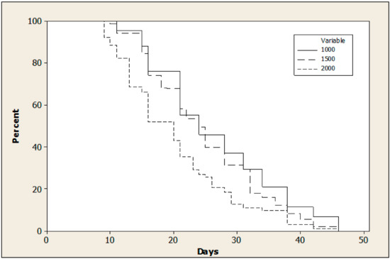 Survival curves of adults according to three different cage densities: 1000, 1500, and 2000 adults with a ratio of one male for three females in standard rearing cages (30 × 30 × 30 cm) with continuous access to 5% (wt:vol) sucrose solution.
