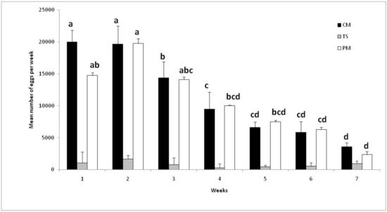 Number of eggs produced by cages fed with cellulose membrane (CM), turkey skin (TS), and Parafilm® membrane (PM). Histograms with the same letter indicate that the results are not significantly different (p > 0.05, Tukey’s HSD post hoc test following an ANOVA procedure within each treatment). No letters indicate no significant difference between the treatments.