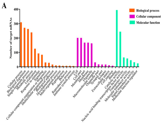 GO categorization of A. c. cerana DEmiRNA target mRNAs. (A) target mRNAs in AcCK1 vs AcT1; (B) target mRNAs in AcCK2 vs AcT2.