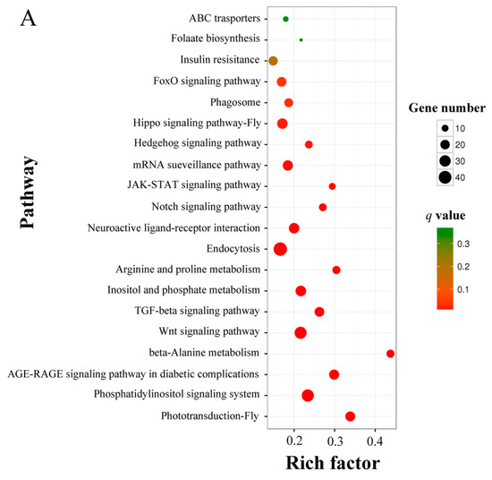 KEGG enrichment analysis for DEmiRNA-targeted genes was conducted, and the results demonstrated that the target mRNAs of shared DEmiRNAs in AcCK1 vs AcT1 were connected with 104 pathways; amongst them, the highest enriched pathways were endocytosis, the phosphatidylinositol signaling system, the Wnt signaling pathway, inositol phosphate metabolism, and neuroactive ligand-receptor interaction (Figure 7A, see also Table S10). The target mRNAs of DEmiRNAs in AcCK2 vs AcT2 were involved in 92 pathways, and the most enriched pathway was the phosphatidylinositol signaling system, followed by the Wnt signaling pathway, phototransduction, endocytosis and the FoxO signaling pathway (Figure 7B, see also Table S11). Interestingly, 62 and 52 metabolism-related pathways were respectively enriched by 234 and 195 target mRNAs in AcCK1 vs AcT1 and AcCK2 vs AcT2, and, in addition, there were five and six target mRNAs enriched in development in these two comparison groups (Table S10 and Table S11). These results demonstrated that DEmiRNAs could regulate the growth, development and metabolism of A. c. cerana workers’ midguts.