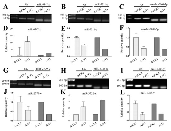 To verify the high-throughput sequencing data in our study, the expression levels of nine randomly selected DEmiRNAs in AcCK1 vs AcT1 and AcCK2 vs AcT2 were examined by RT-qPCR. The expression trends of eight DEmiRNAs in the two comparison groups were roughly the same as the result of the sRNA-seq (Figure 9), indicative of the accuracy and reliability of our sequencing data.