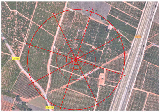 This study was conducted in Partida de Benadresa (coordinates: 39°59′41.9″ N, 0°07′20.0″ W), located in the municipality of Castelló de la Plana (Castellón, Spain). The study area had a mixed orchard containing various citrus varieties. An array of 40 traps was used to recapture the released flies. Groups of eight traps following eight different orientations were concentrically deployed at 10, 25, 50, 100, and 250 m from the release point (Figure 1) and covered a total area of ~20 ha.