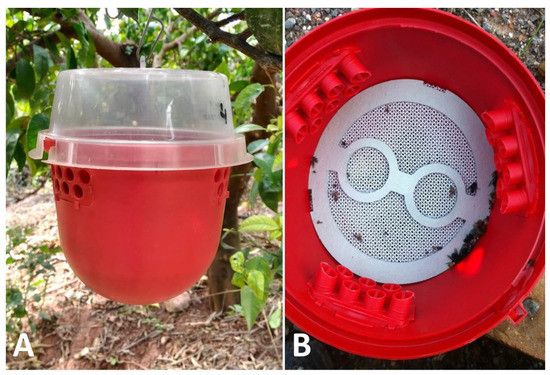 Trap employed to capture both D. suzukii and C. capitata (A), with tailored mesh placed at mid-height to avoid the captured flies coming into direct contact with attractants (B).