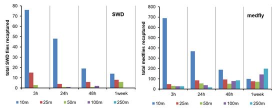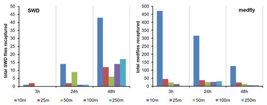 Total number of recaptured flies (left: D. suzukii (SWD); right: C. capitata (medfly)) at each sampling interval and at different distances from the release point during the three autumn 2015 trials.