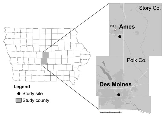 Overview of trapping locations in central Iowa. Historical mosquito abundance data were examined from study sites in two central Iowa counties (Story and Polk) over a 34-year period. The Story County site was located in Ames (urbanizing), near Iowa State University (star), while the Polk County site was located in Des Moines (established urban). For county maps, major highways (white lines), urban areas (medium gray shading), and rivers/lakes (dark grey) are denoted to display county features.