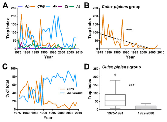 Temporal analysis of mosquito abundance from the Ames, Iowa trap site (1975–2008). Trap index averages (standardized abundance) for each year at the Ames site for the five most abundant mosquito species (A): Anopheles punctipennis (Ap), Culex pipiens group (CPG), Aedes vexans (Av), Culex tarsalis (Ct), and Aedes triseriatus (At). A significant decline in CPG populations were detected over the study period when analyzed by simple linear regression (R2 = 0.3719, p < 0.0001, F = 18.95, df: 1, 32) (B) The dynamics between the two most abundant species, Ae. vexans and CPG, are more apparent when examined by relative abundance where distinct differences in populations are observed sometime after 1990 (C). When CPG populations are compared between the first half of the trapping period (1975–1991) and the second half (1991–2008), there are significant differences in the overall trap index when analyzed using Mann-Whitney analysis (p < 0.0001, two-tailed, exact) (D).