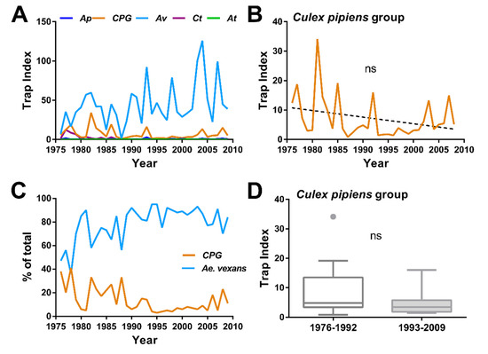 Temporal analysis of mosquito data from the Des Moines, Iowa trap site (1976–2009). Trap index averages (standardized counts) for each year at the Des Moines site for the five most collected mosquito species (A): Anopheles punctipennis (Ap), Culex pipiens group (CPG), Aedes vexans (Av), Culex tarsalis (Ct), and Aedes triseriatus (At). The relative abundance of the two most common species, Ae. vexans and CPG, are displayed over the study period (B). No significant differences (R2 = 0.07793, p = 0.1099, F = 2.704, df: 1, 32) were detected in Culex pipiens group (CPG) populations over time using simple linear regression (C) or when trap index averages were compared for the first half (1976–1992) and the second half (1993–2009) of the study using Mann-Whitney analysis (p = 0.1598, two-tailed, exact) (D).