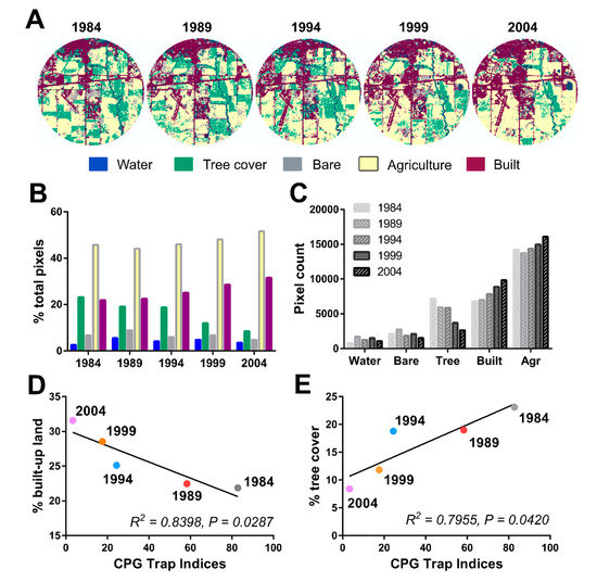 Changes in land use and land cover near the Ames site from 1984–2004. A supervised classification time series of land use/land cover every five years from 1984 to 2004 shows increases in built-up land over time (maroon) and a decrease in tree-covered land (green) in a 4 km fixed area around the Ames trap site (A). Changes in land use/land cover classification are displayed by each year according to classification (B) or by classification over time (C). Values are displayed as percentages of total pixels or total pixel count respectively. Relationships of CPG abundance (averaged over a five-year period ending in the year displayed) were examined by simple linear regression with the percentage of built-up land (D) or percent tree cover (E). Land use percentages for the 5-year intervals were derived from land use/land cover classifications above.