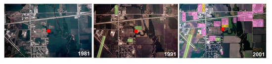 Specific land use modifications near the Ames site from 1981–2001. Satellite images at ten-year intervals from 1981 to 2001 were used to identify locations that underwent substantial changes in land use. The red dot denotes the trap location, while specific changes are displayed in green (occurring between 1981–1991), purple (occurring between 1991–2001), or yellow (occurring between 1991–2001 at a location that had previously been modified).