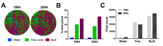 Changes in land use and land-cover near the Des Moines site from 1984–2004. A supervised classification of land use/land cover was performed for 1984 and 2004 to measure built-up land (maroon) and tree-covered land (green) over time using a 4km fixed area around the Des Moines trap site (A). Changes in land use/land cover classification are displayed by each year according to classification (B) or by classification over time (C). Values are displayed as percentages of total pixels or total pixel count respectively. Land use classifications falling under the agriculture or bare terms were not identified for the Des Moines site and were therefore excluded in the presentation of the data.