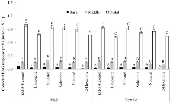 EAG responses of different groups of male and female A. bungii flagellomeres (basal, first to third; middle, fourth to sixth; distal, seventh to ninth) to 1 mg loads of six VOCs.