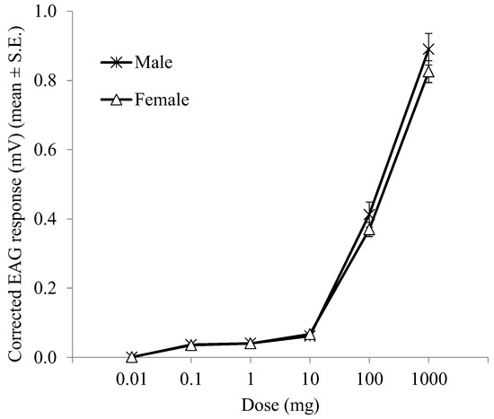 EAG dose-response curves of male and female A. bungii distal flagellomeres (seventh to ninth) to ascending doses of (Z)-3-hexenol.