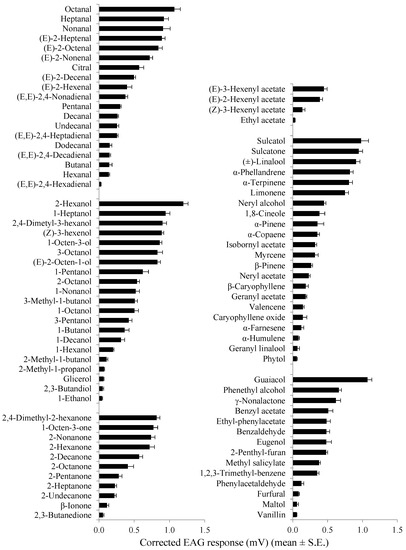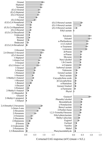The largest EAG responses (> 0.8 mV) were elicited by 2-hexanol, octanal, sulcatone, guaiacol, sulcatol, 2,4-dimethyl-3-hexanol, 2,4-dimethyl-2-hexanone, heptanal, nonanal, (Z)-3-hexenol, and 1-heptanol in both sexes, and by linalool, (E)-2-heptenal, 1-octen-3-ol, (E)-2-octenal, 3-octanol, (E)-2-octen-1-ol, α-phellandrene, and α-terpinene in males.