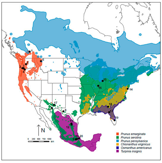Map of collecting sites. Shown are numbered sampling locations for R. cingulata group flies from across North America. See Table 1 for designations and descriptions of study sites. Green indicates the range of Prunus serotina, black cherry; orange the range of P. emarginata, bitter cherry; dark blue the range of Osmanthus americanus, the tea olive or devilwood; gold the range of Chionanthus virginicus, the fringe-tree [28,29,30]. The range of Turpinia insignis (purple), muttonwood, was estimated from [31]; however, see Figure S1 for the range of T. insignis in Veracruz, Mexico, the only known site of infestation with R. turpiniae [32,33,34,35]. Also shown in blue is the range of P. pensylvanica, the pin cherry, that was not sampled in the current study but could potentially be a host bridging the Eastern USA population of R. cingulata with the Northwestern USA and Canadian population of R. indifferens.
