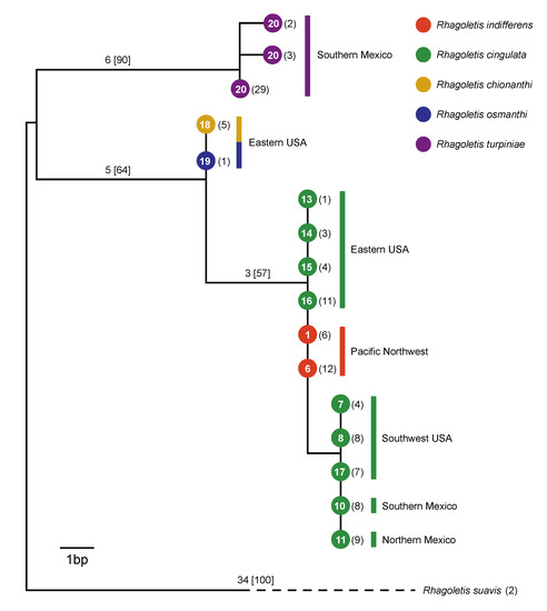 Mitochondrial DNA sequence data were generated for a 609 bp fragment of the cytochrome oxidase II (COII) gene using the primers C2-J-3138 and TK-N-3782 [61]. Methods used for Sanger sequencing of mtDNA by the University of Arizona Genetics Core facility in Tucson, AZ can be found in Doellman et al. [36]. GenBank accession numbers for R. cingulata and R. indifferens mtDNA sequences from Doellman et al. [36] are KT221476-KT22179. In addition, new mtDNA sequence data were generated for R. chionanthi from site 18 (n = 5), R. osmanthi from site 19 (n = 1), and R. turpiniae from site 20 (n = 34; GenBank accession numbers MN366239-MN366243). A maximum parsimony mtDNA gene tree was constructed for COII haplotypes using PAUP*b8 (Swofford 2000). Two sequences from the outgroup species R. suavis from East Lansing, MI were used to root the haplotype network (GenBank accessions HQ677149, AY152493).