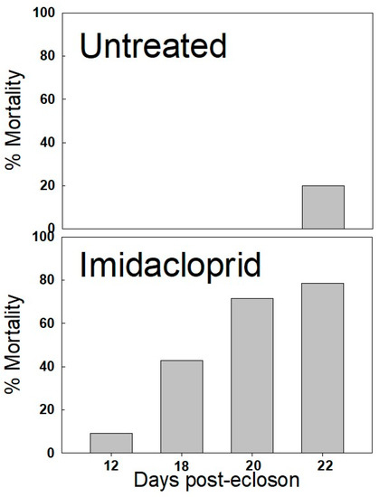A commercial neonicotinoid concentrate formulation (Fruit, Citrus & Vegetable Insect Control, Bioadvanced, SBM Life Science Corp, Cary, NC, USA) containing 0.235% (2,350,000 ppb) imidacloprid was used to prepare the treated sugar diet. A treatment rate of 23.5 ppb was prepared by serial dilution with distilled water containing 5% sugar. This rate is a field-realistic level for imidacloprid and other neonicotinoids within the range reported in crop and wildflower nectar and pollen [,,,,].