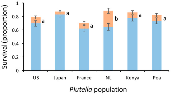 Survival to adulthood (blue bars: mean proportion ± SE) of Plutella xylostella caterpillars from populations originating from the US, Japan, France, the Netherlands (NL), and Kenya, as well as a population adapted to pea in Kenya. Orange bars present the proportion of P. xylostella pupae that did not emerge as adults. Orange bars with the same letter are not significantly different (blue bars are not significantly different from each other). For each population, 13 caterpillars were introduced on each of 10 to12 Brassica rapa plants.