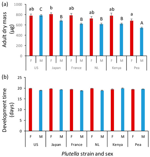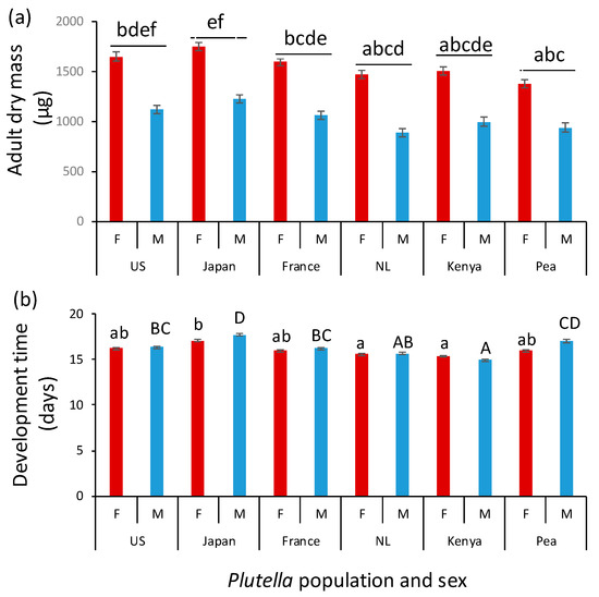 Mean (±SE) adult dry mass (a) and egg-to-adult development time (b) of females (red bars) and males (blue bars) of Plutella xylostella populations originating from the US, Japan, France, the Netherlands (NL), and Kenya, as well as a population adapted to pea in Kenya. Thirteen caterpillars of each population were introduced on each of 10 to 12 Brassica rapa plants. Male (capital letters) and female (small letters) data were analyzed separately in panel (b). Bars with the same letter are not significantly different.