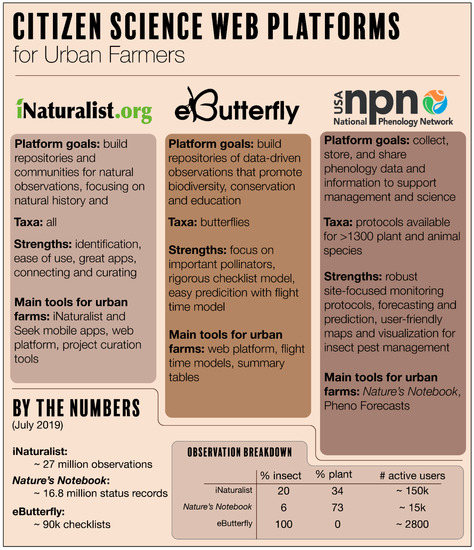 Citizen science relies on the participation of non-professionals in the practices of science, from study design to data collection [43]. Most citizen science data are collected in urban areas (e.g., [44,45]), and both urban farms and citizen science are conduits for community building and civic participation. Additionally, citizen science aligns with many social media outlets to promote a farm with a variety of stakeholders and potential customers. A number of powerful tools and platforms exist to build the connections and collect data required for successful agroecosystem management in the urban socio-ecological context. While there are many citizen science practices, we focused on web-based programs which focus on biodiversity and serve to identify species, store data, and synthesize patterns of diversity.