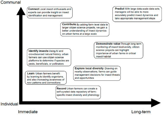 Value schematic of citizen science web-platforms for urban growers. Collaborative citizen science programs add value to urban farm mission and management by offering connection to experts, customers, and community members. Here, we outlined the main ways that urban farms can use citizen science platforms, across two axes: immediate and long-term usage (horizontal) and individual and communal actions among users (vertical).