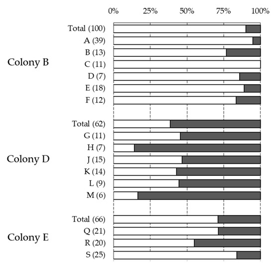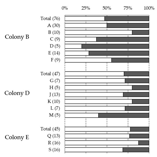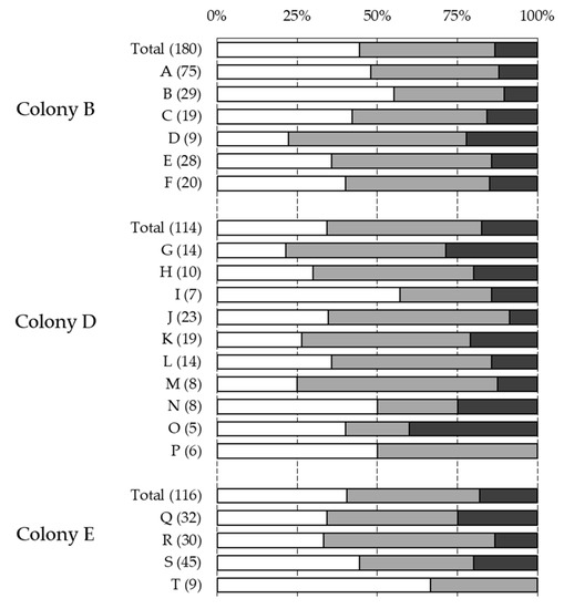 To analyze whether the different phenotypes matched the workers’ genotypes, the individuals from three colonies (B, D and E, N = 556 pupae) were sent to Genoscreen (Lille, France) to be genotyped on a 3730 XL sequencer (Applied Biosystems®, Foster City, CA, USA) at five microsatellite markers [,] (Table S2) using a single marker per PCR reaction and following the standard conditions detailed in []. The three colonies used for genotyping were selected according to their level of variability of the phenotypes, the dates when they could be sampled, and the number of pupae collected. Once retrieved, the genotypic data were scored manually using Peak Scanner v. 1.0 (Applied Biosystems®). The genotyping process was repeated once per sample if the first PCRs did not work. After this, individuals with missing data were discarded, resulting in a final dataset including 486 individuals.