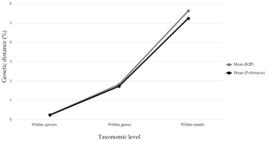 Line chart of mean genetic distances along with different taxonomic levels based on Kimura 2 parameter (K2P) and prior intraspecific divergence (P) distance models.