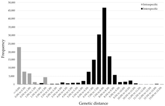 Frequency histogram of intra- and inter-specific (congeneric) genetic distances of subtropical aphids based on 1581 cytochrome oxidase subunit I (COI) sequences in our study.