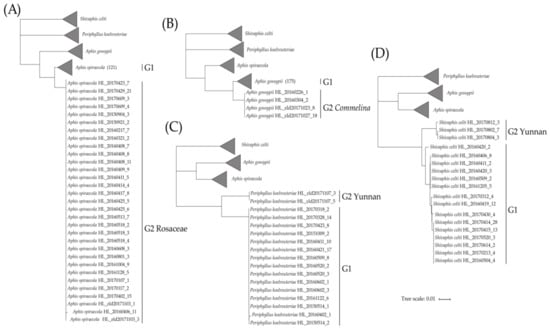 Simplified neighbor-joining cladograms of four species with obvious divergence, with each cladogram representing one species and the other three as outgroups. (A) Aphis spiraecola, (B) A. gossypii, (C) Periphyllus koelreuteriae, and (D) Shivaphis celti.