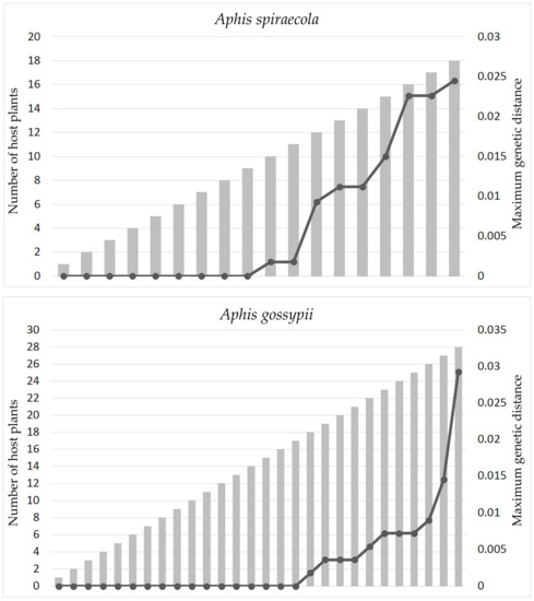 The distribution of intraspecific genetic distances of Aphis spiraecola and A. gossypii based on inclusion of samples from different host plant families. The gray bar indicates the number of host plant families, and the black line indicates the maximum intraspecific genetic distance.